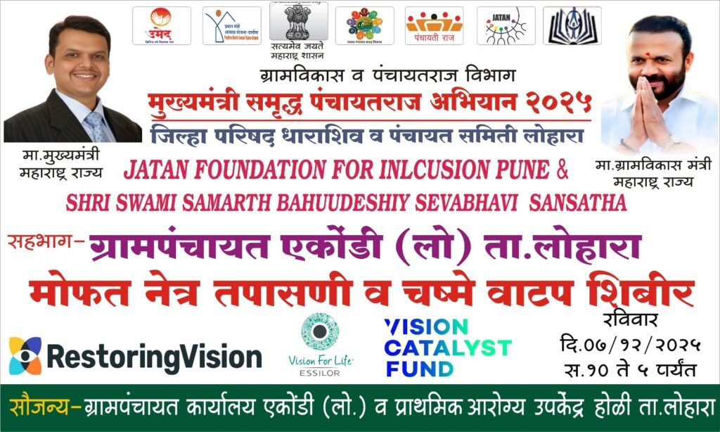 मुख्यमंत्री समृद्ध पंचायतराज अभियानांतर्गत लोहारा तालुक्यातील एकोंडी (लो) येथे ग्रामपंचायत कार्यालयात रविवारी (दि.७) मोफत नेत्र तपासणी व चष्मे वाटप कार्यक्रम घेण्यात आला. यात गावातील १२७ स्त्री-पुरुष यांच्या डोळ्यांची तपासणी करून चष्मे वाटप करण्यात आले.