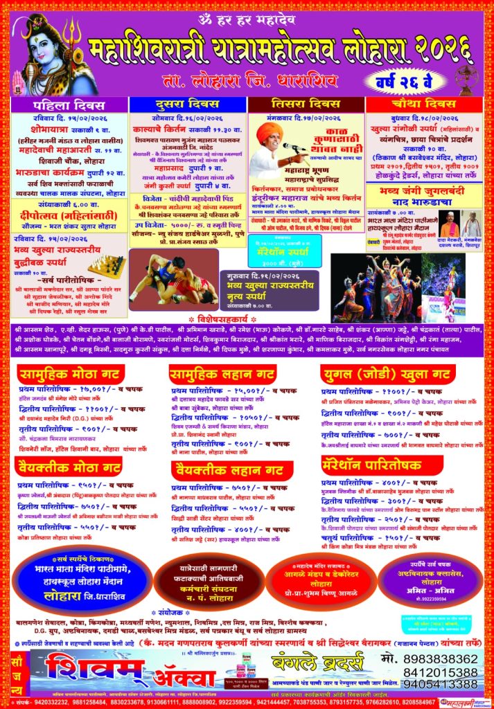 लोहारा शहरात महाशिवरात्री निमित्त दरवर्षी यात्रा महोत्सव आयोजित करण्यात येतो. यावर्षीचे हे २६ वे वर्ष आहे. यात्रा महोत्सवात पाच दिवस विविध कार्यक्रमांचे आयोजन करण्यात आले आहे. दि. १५ ते १९ फेब्रुवारी या कालावधीत हा यात्रा महोत्सव होणार आहे. या यात्रा महोत्सवाची जय्यत तयारी सुरू आहे.