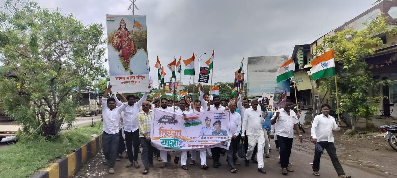 भारतीय सैन्याने ऑपरेशन सिंदूरच्या माध्यमातून पाकिस्तानचे कंबरडे मोडले. भारतीय सैन्याच्या या शौर्याचा सन्मान करण्यासाठी रविवारी (दि.२५) लोहारा शहरात भारत माता मंदिर ते तहसील कार्यालय दरम्यान तिरंगा यात्रा काढण्यात आली. या पायी यात्रेमध्ये लोहारा शहर व तालुक्यातील माजी सैनिक, प्रतिष्ठित नागरिक, विद्यार्थी मोठ्या संख्येने सहभागी झाले होते. यावेळी भारत माता की जय, वंदे मातरम् अशा घोषणा देण्यात आल्या. ही पायी यात्रा तहसील कार्याजवळ आल्यानंतर माजी सैनिक राजेंद्र सुर्यवंशी, सुधीर पाटील, रमेश ठेले, महादेव सलगर, प्रकाश मुळे, शिवाजी मुलगे, चंद्रकांत थोरात, अजय जाधव, इंद्रजित सुर्यवंशी, दिलीप पवार यांचा सत्कार करण्यात आला. या तिरंगा यात्रेत शिवशंकर हत्तरगे, जगन्नाथ पाटील, शामसुंदर तोरकडे, अमिन सुंबेकर, राजेंद्र पाटील, दगडु तिगाडे, अविनाश माळी, प्रशांत काळे, दिपक मुळे, नेताजी शिंदे, विक्रांत संगशेट्टी, अनिल ओवांडकर, इकबाल मुल्ला,